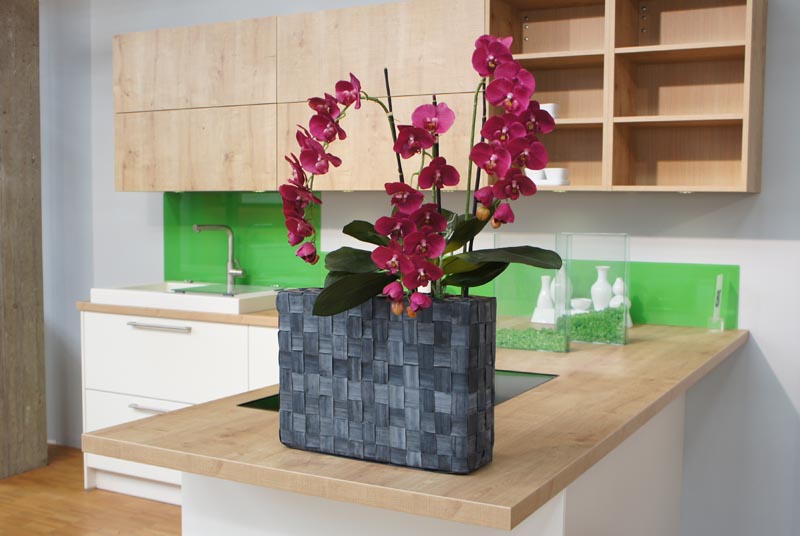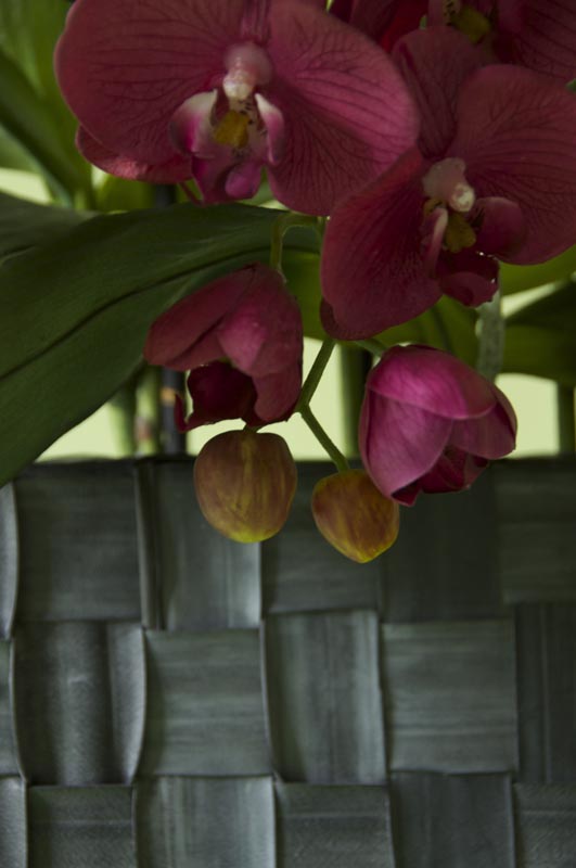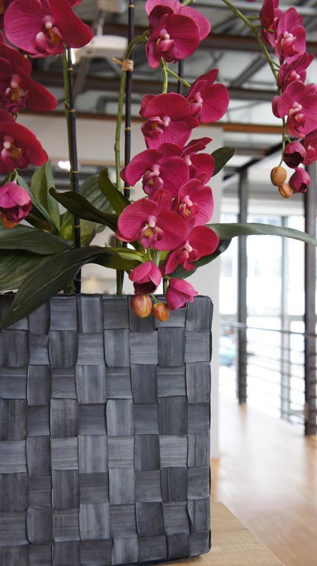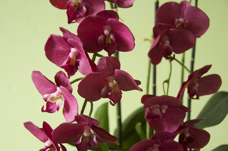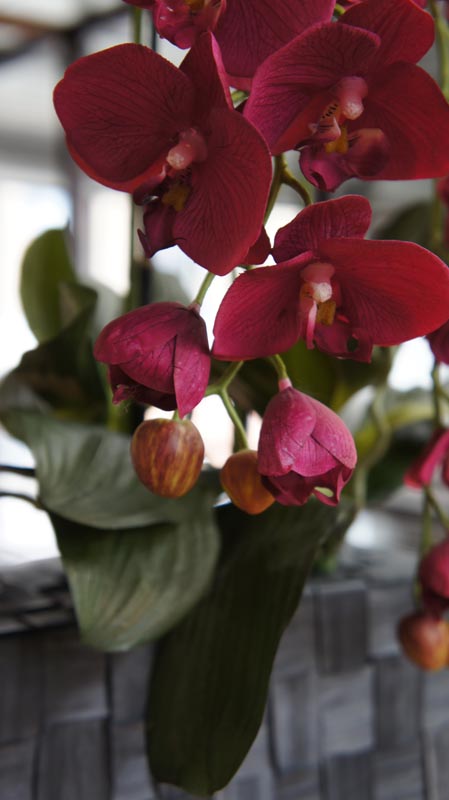 3 Stiele Orchideen/Phalaenopsis an Bambusstäben, Blüte mit Silikonfinish in purpurrot mit