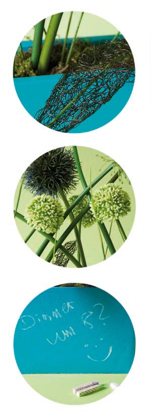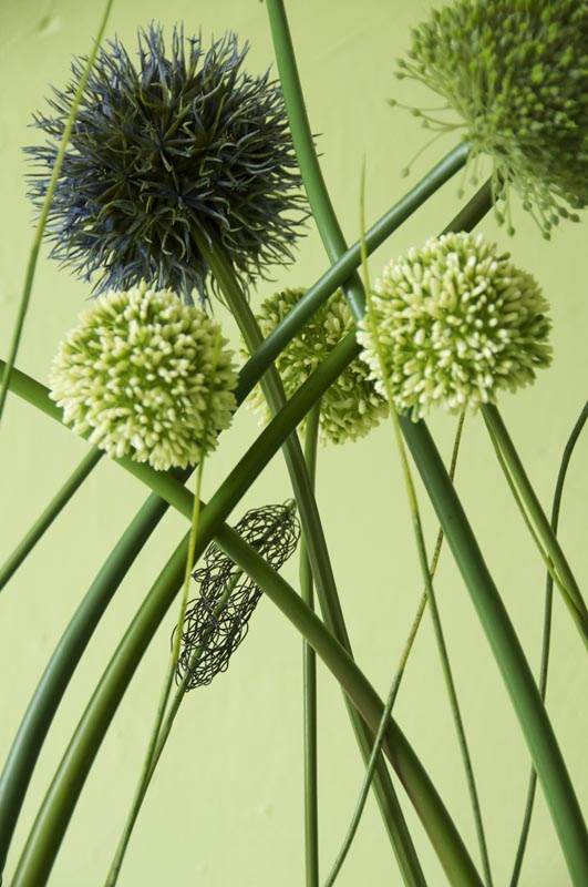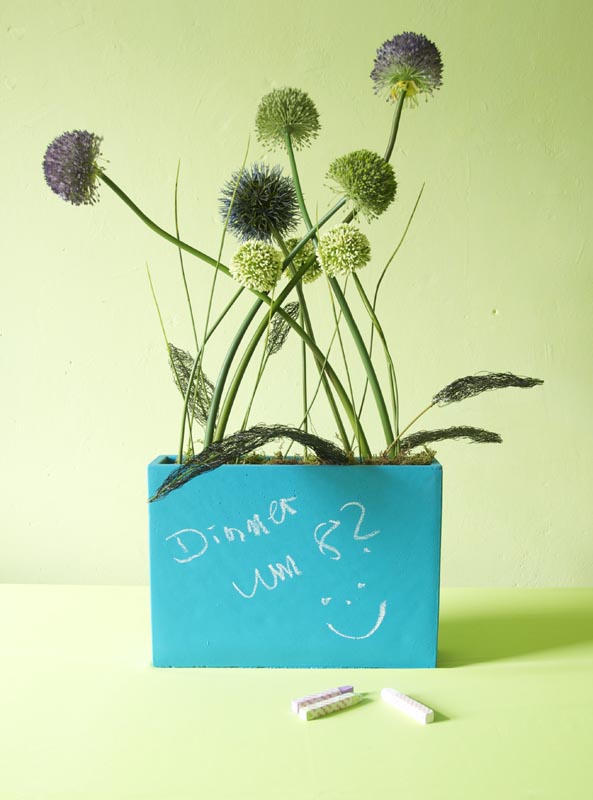 Gefäß: Rechteckiges Gefäß 8 Stiele Allium in violett, dunkelblau, grün und creme. Gesamthöhe ca. 85cm, Breit ca. 60 cm, Gewicht ca. 8 kg.