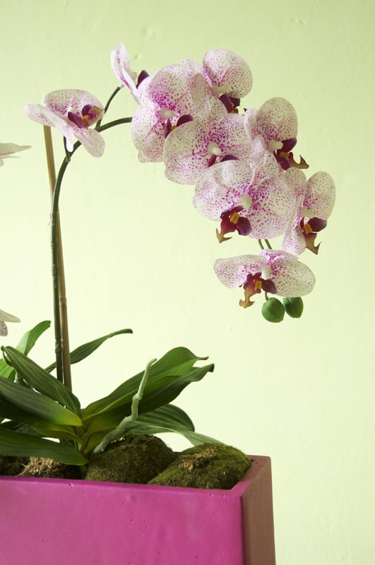 Gefäß: Rechteckiges Gefäß 3 Stiele weiß-pinker Orchidee/Phalaenopsis, Blätter & Luftwurzeln. Gefäß aufgefüllt mit Moosschwämmen. Gesamthöhe ca. 75cm, Breit ca. 60 cm, Gewicht ca. 7,9 kg.