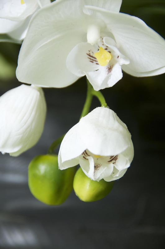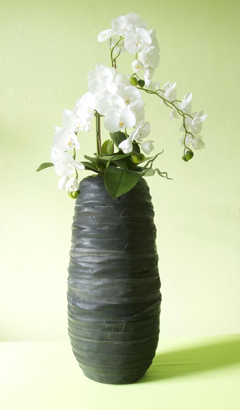 3 Stiele weißer Orchideen/Phalaenopsis an Bambusstäben, Blüte mit Silikonfinish, Blätter und Luftwurzeln. Gefäßöffnung abgedeckt mit Moosschwämmen.