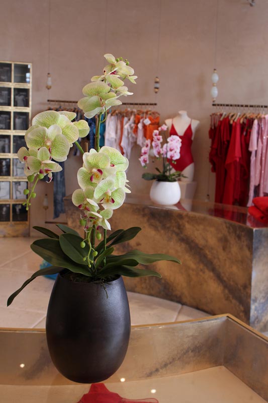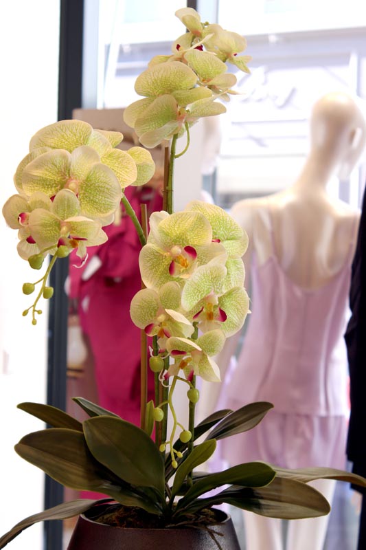 3 Stiele Orchideen/Phalaenopsis an Bambusstäben, textile Blüte ohne Silikonfinish in hellgrün mit pink. Gefäßöffnung aufgefüllt mit Moosschwämmen.