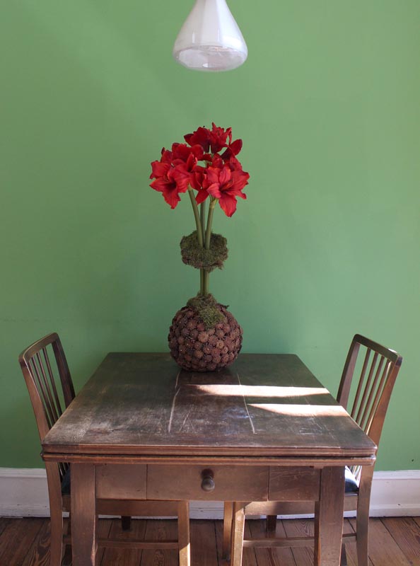 3 Stiele roter Amaryllis mit je 3 Blüten. Dazu Ring aus Naturmoos.
